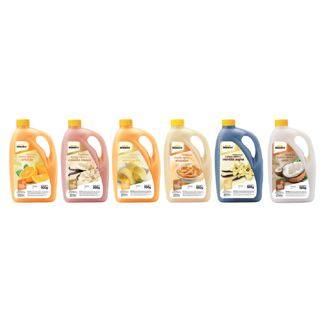 • Vainilla Blanca, Mantequilla, Arequipe, vainilla Negra, Coco, Botella plástica de 500 ml, Botella